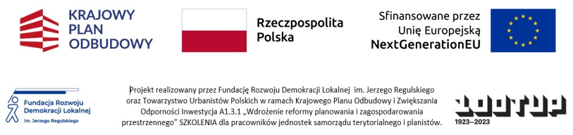 Fundacja Rozwoju Demokracji Lokalnej im. Jerzego Regulskiego realizuje projekt „Szkolenia dla uczestników z województwa pomorskiego w zakresie znowelizowanej ustawy o planowaniu i zagospodarowaniu przestrzennym". Projekt realizowany w partnerstwie z Towarzystwem Urbanistów Polskich w ramach Krajowego Planu Odbudowy i Zwiększana Odporności. Inwestycja A1.3.1 Wdrożenie reformy planowania i zagospodarowaniu przestrzennego. Szkolenia dla pracowników jednostek samorządu terytorialnego i planistów. Nr umowy projektowej 22/KPO/MRIT/A1.3.1/SZKOL/DPR/24. Nr projektu KPOD.01.06-IP.05-0013/24.
