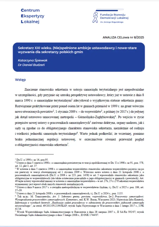 Przedmiotem opracowania jest analiza skuteczności wdrożenia ustawy o pracownikach samorządowych z 21 listopada 2008 r. w odniesieniu do stanowiska sekretarza. Jej wynik ma otworzyć dyskusję nad pożądanym statusem i profilem zawodowym sekretarza. Główne postulaty to: umocowanie w ustawie zamkniętego katalogu zadań sekretarza, rozważenie docelowego statusu sekretarza w jednostce samorządu terytorialnego oraz konieczność wzmocnienia kompetencji samorządowej kadry zarządzającej w zakresie projektowania polityki personalnej i zarządzania personelem.