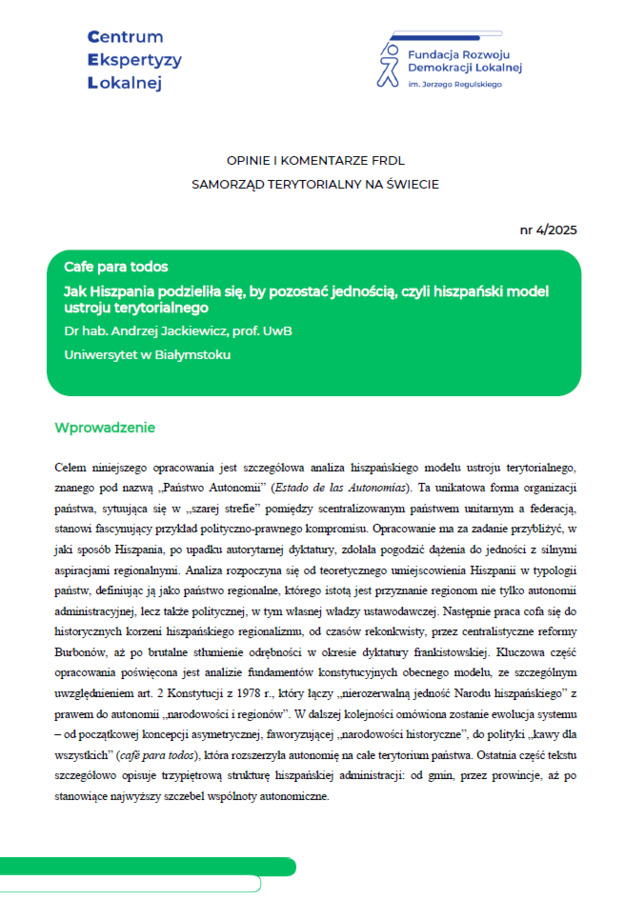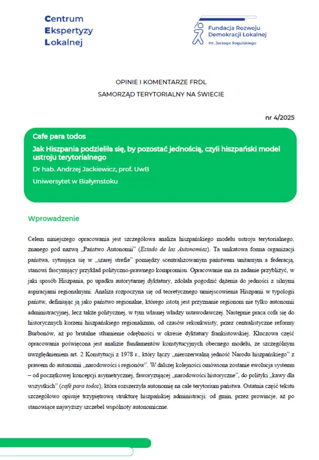 Przedmiotem opracowania jest hiszpański model ustroju terytorialnego, znany jako „Państwo Autonomii” (Estado de las Autonomías). Opracowanie sytuuje ten model jako formę pośrednią między scentralizowanym państwem unitarnym a federacją, podkreślając jego doktrynalny, a nie czysto prawny charakter. Celem tekstu jest analiza jego złożonej genezy, ewolucji oraz fundamentalnych zasad prawnych i strukturalnych. Najważniejsze ustalenia wskazują, że u jego podstaw leży świadome napięcie wpisane w Konstytucję z 1978 r., która łączy zasadę „nierozerwalnej jedności Narodu hiszpańskiego” z gwarancją „prawa do autonomii stanowiących go narodowości i